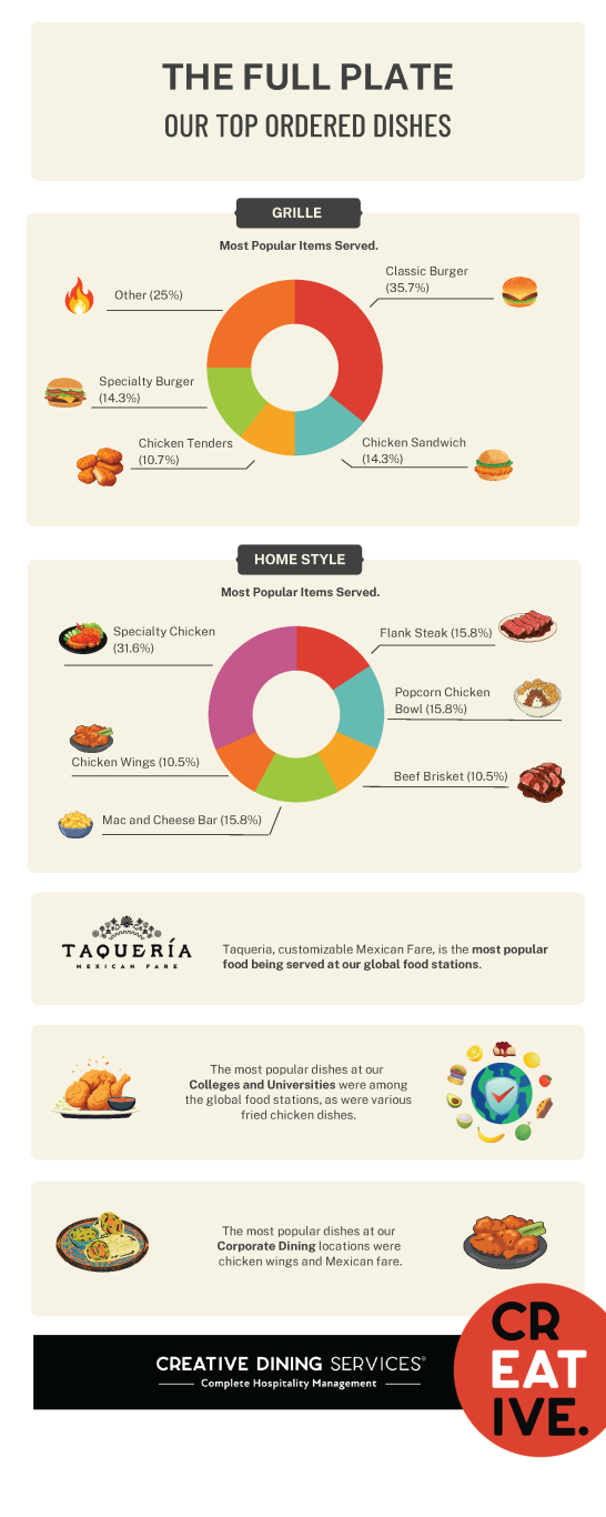 What do diners really want when they walk into a dining hall or café? To answer that, we went straight to the experts—the Executive Chefs who serve thousands of guests every day across our campus and corporate dining locations. From Michigan to Florida and Colorado to the Carolinas, we surveyed chefs to uncover the most-requested dishes, emerging trends, and the reliable favorites that never leave the menu.